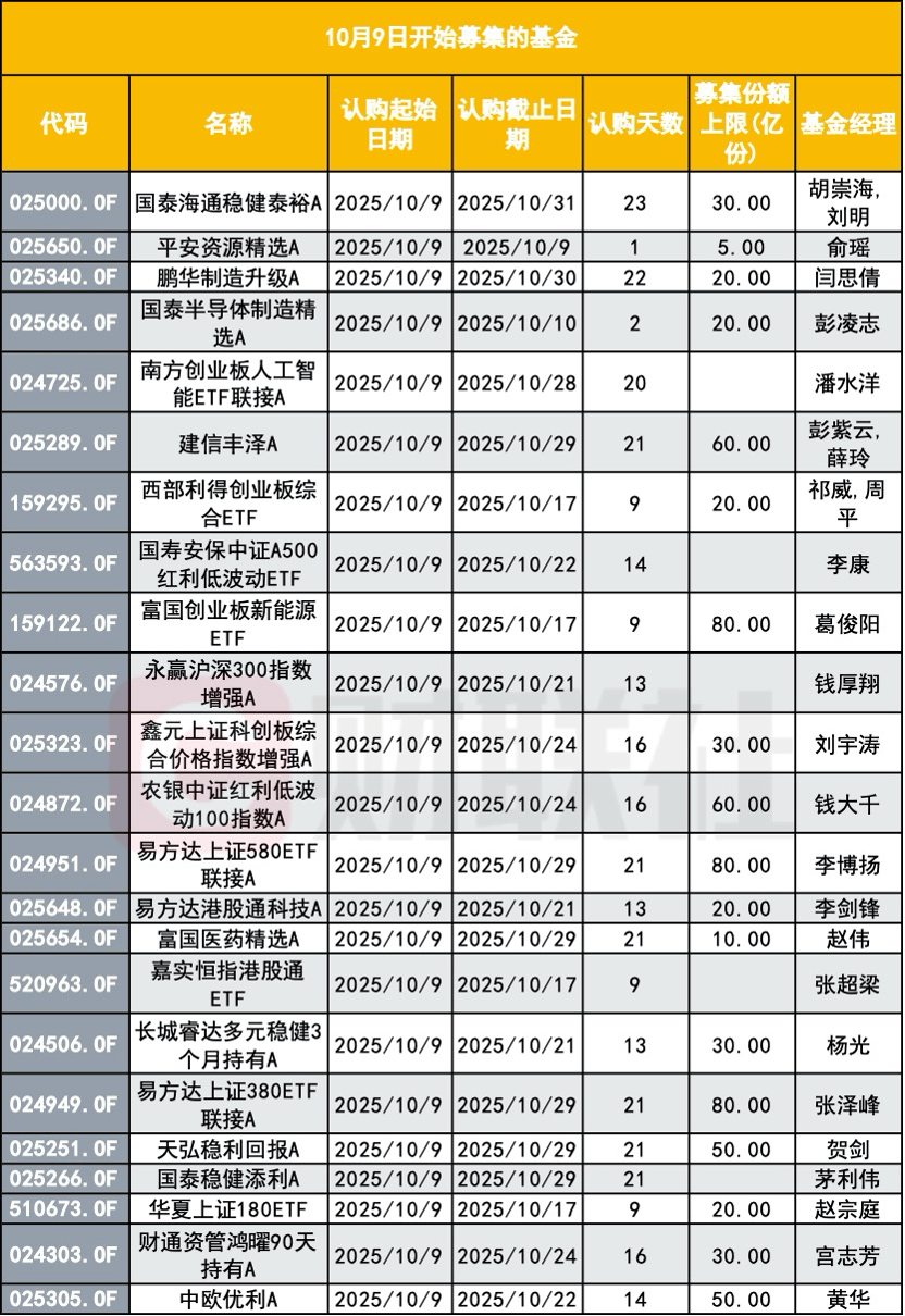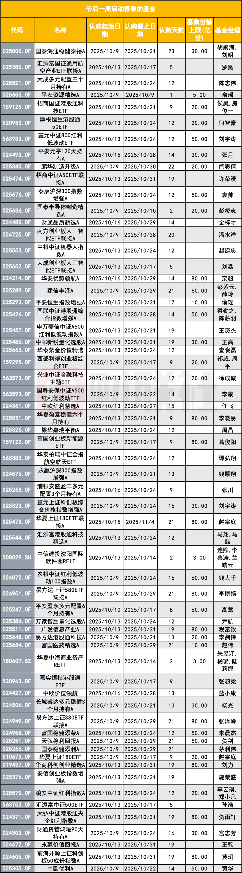 从时间节点来看,十一假期成为今年基金发行的重要分水岭。据Wind数据显示,仅10月9日一个交易日,就有23只新基金开启发行;整个节后一周内(10月9日-16日),已有至少62只产品定档,展现出市场对年末行情的乐观预期。而在这批产品中,知名基金经理的挂帅无疑成为最大亮点。