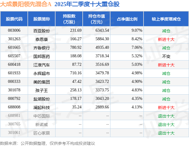 根据2025基金半年报公募基金重仓股数据,重仓该股的公募基金共11家,其中持有数量最多的公募基金为大成基金的大成景阳领先混合A。大成景阳领先混合A目前规模为6.74亿元,最新净值0.8193(10月16日),较上一交易日下跌0.8%,近一年上涨18.21%。该公募基金现任基金经理为齐炜中。齐炜中在任的基金产品包括:大成消费主题混合A,管理时间为2020年2月3日至今,期间收益率为102.69%;大成一带一路灵活配置混合A,管理时间为2021年3月17日至今,期间收益率为31.81%;大成蓝筹稳健混合A,管理时间为2021年6月21日至今,期间收益率为-1.35%。
