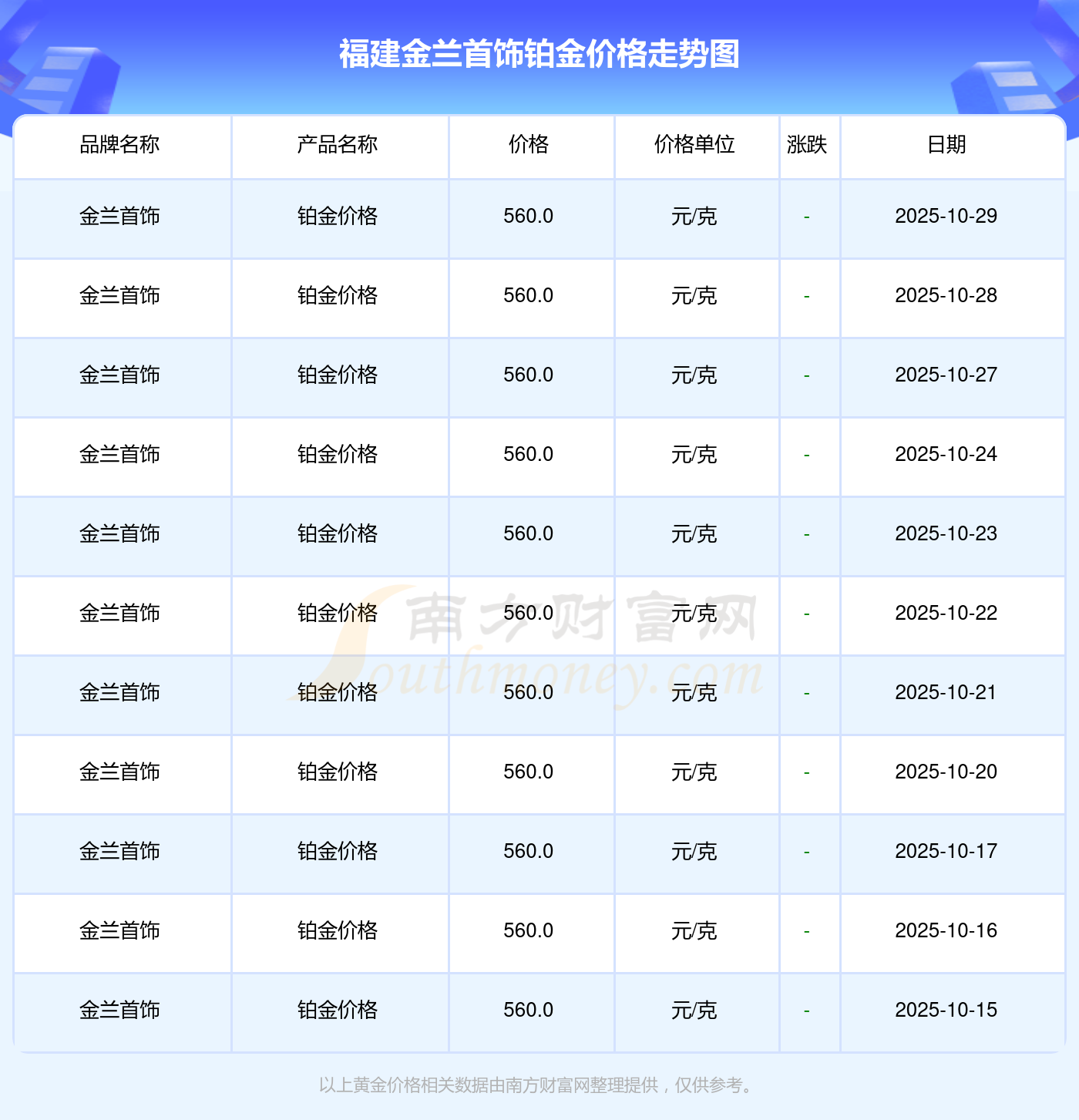 今日(2025年10月29日)福建金兰首饰铂金价格最新价格为560.0元/克。