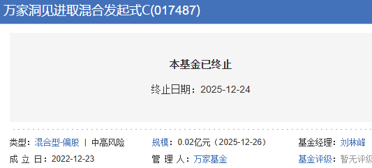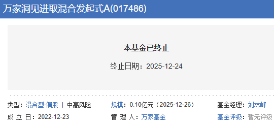 截至2025年12月31日最后一次披露净值日,万家洞见进取混合发起式A/C的累计单位净值为0.8395元、0.8271元,累计收益率为-16.05%、-17.29%。
