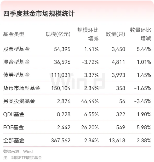 2025年四季度末,公募基金规模达36.76万亿元,较上季度环比增长2.34%。